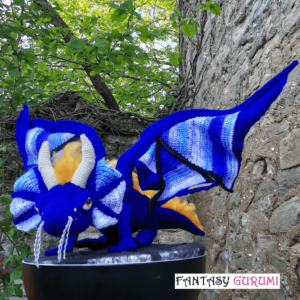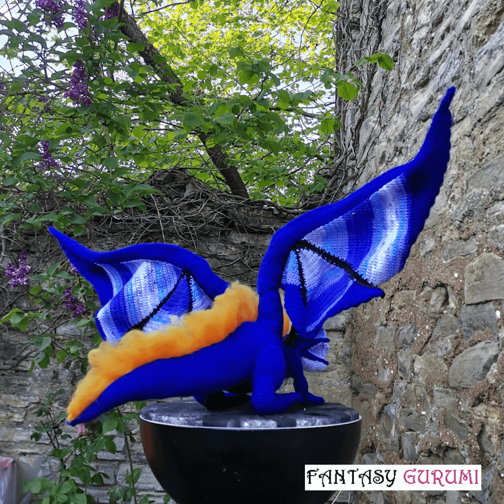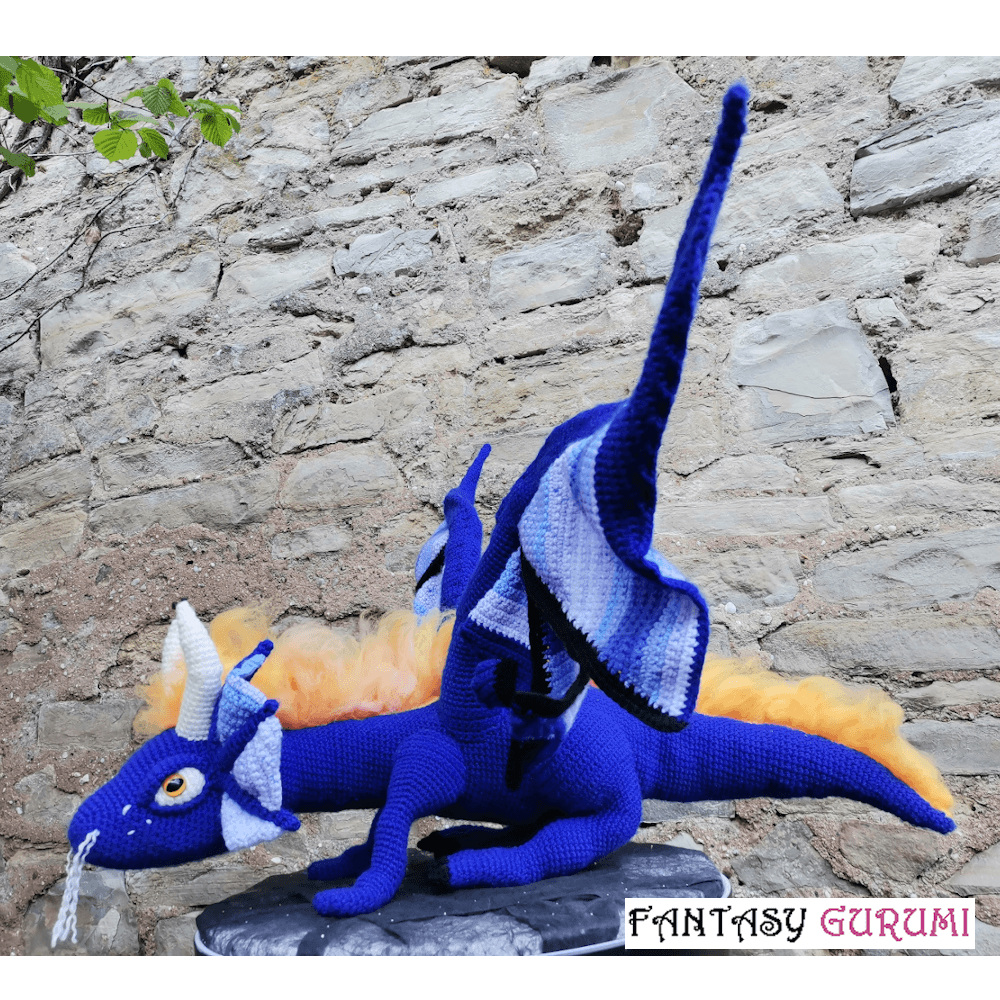 Ce dragon mesure environ 70 cm de long sur 30 cm de haut. Il a été conçu en acrylique et en laine de mouton lorraine sélectionnée pour ses qualités écologiques, locales et durables. Il est crocheté entièrement à la main. Les finitions sont soignées et invisibles. Il dispose d’une armature métallique à l’intérieur du corps, des pattes et des ailes, elles permettent de modifier la posture du dragon à votre convenance. Avec ses ailes d’une envergure de 120 cm déployées, ce splendide dragon va vous faire tourner la tête.