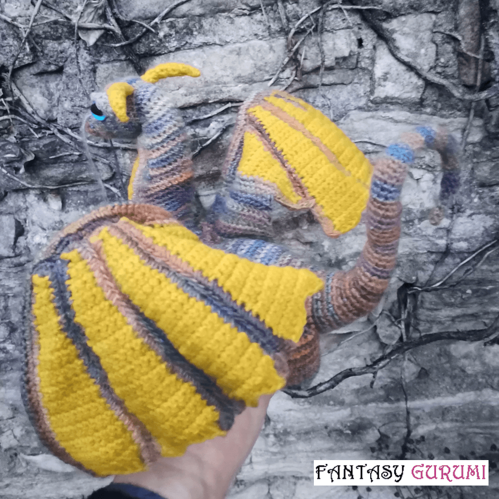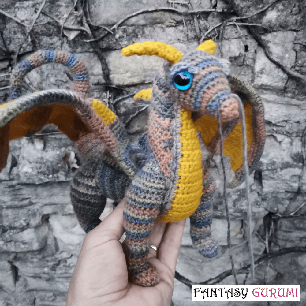 Le dragon mesure environ 53 cm de long sur 22 cm de haut. Il est crocheté entièrement à la main avec fil de qualité (mélange de laine et d’acrylique) provenant d’une boutique de laine locale basée à Nancy (54-Meurthe et Moselle). De plus, il est rembourré en laine de mouton lorraine sélectionnée pour ses qualités écologiques, locales et durables.