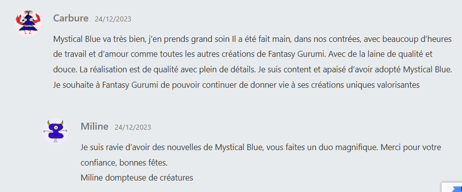 Chez Fantasy Gurumi, chaque client est important. Nous prenons le temps de répondre à vos questions, de discuter de vos envies, et de vous accompagner dans le choix de l’amigurumi parfait. Votre satisfaction est notre priorité !